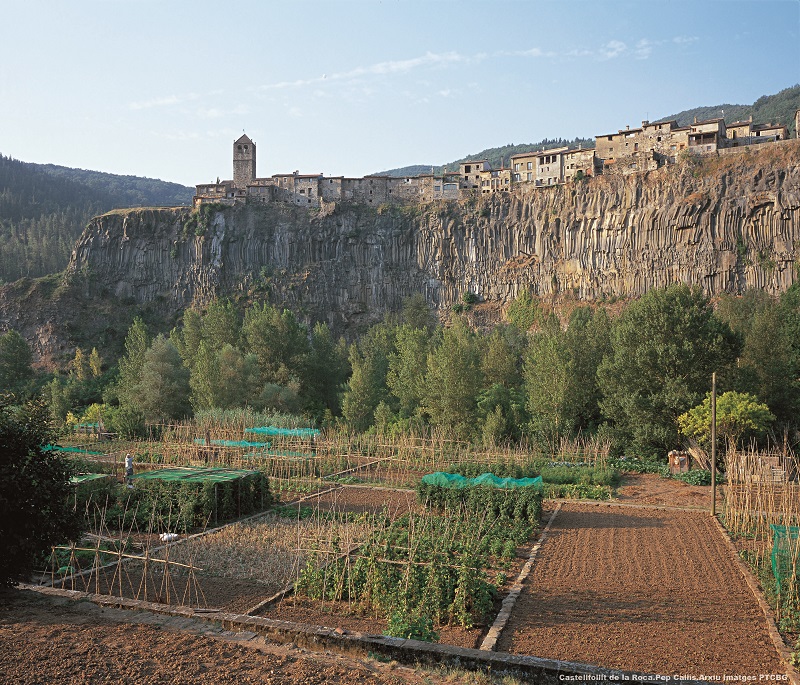 Das Dorf Castellfollit de la Roca erhebt sich über bizarr geformten, 40 Meter hohen Basaltfelsen. Die Häuser des Dorfes mit mittelalterlich engen Gassen und malerischen Plätzen sind zum großen Teil aus vulkanischem Material erbaut, der Straßenbelag des alten Dorfkerns besteht ebenfalls aus Basalt, anderes gesagt, aus erkalteter Lava.
